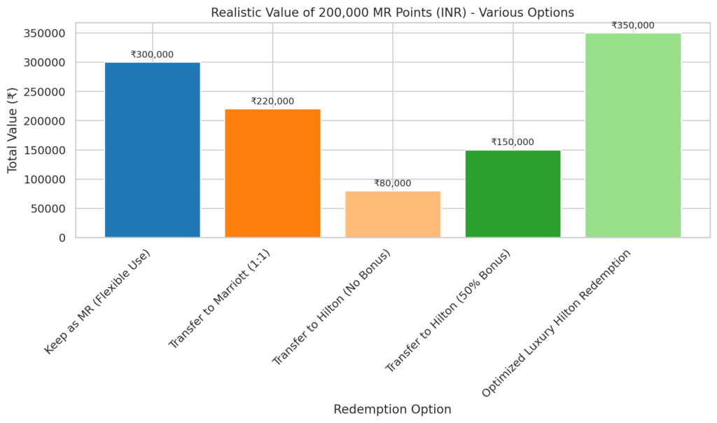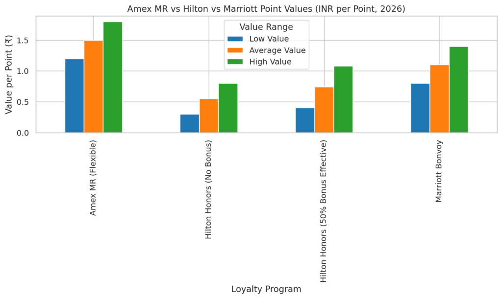 The 50% Hilton bonus is the strongest hotel transfer promotion Amex India has run in 2026. For targeted luxury resort trips, it can deliver ₹2.5L–₹9L+ in value from 200,000 MR points. For everyone else, Marriott and airlines remain safer.