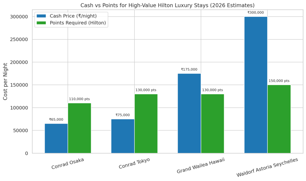 | Property | Points/Night | Cash/Night (INR) | Value per Hilton Point | 5-Night Total Points (after free night) | Effective Value of 270k Hilton Points |