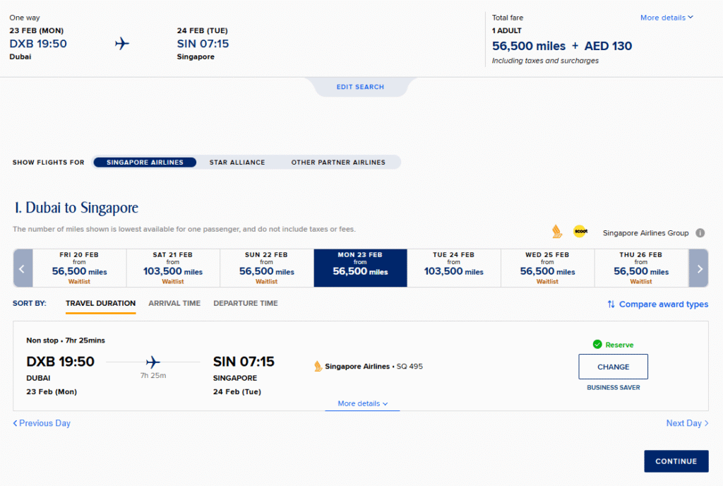 • 56,500 KrisFlyer miles + 130 AED (~₹3,185) in taxes/fees.