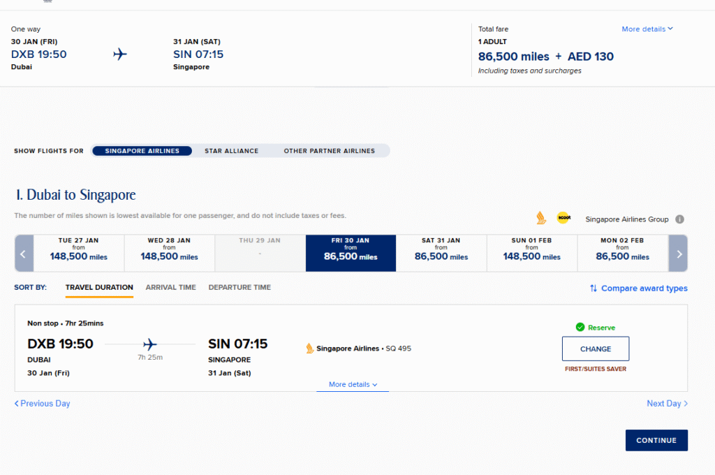 • 86,500 KrisFlyer miles + 130 AED (~₹3,185) in taxes/fees.