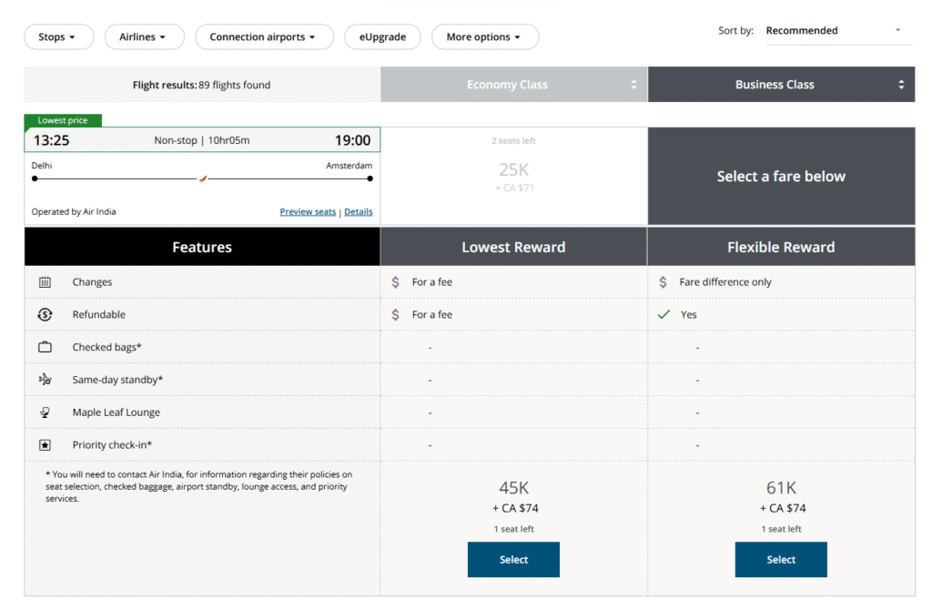 • 45,000 Aeroplan points + ~CA$74 (approximately ₹4,500-₹5,000, depending on exchange rates) in taxes/fees.