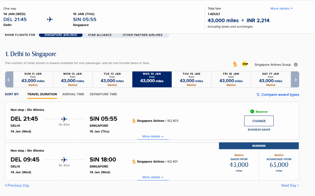 • 43,000 KrisFlyer miles + ₹2,214 in taxes/fees.